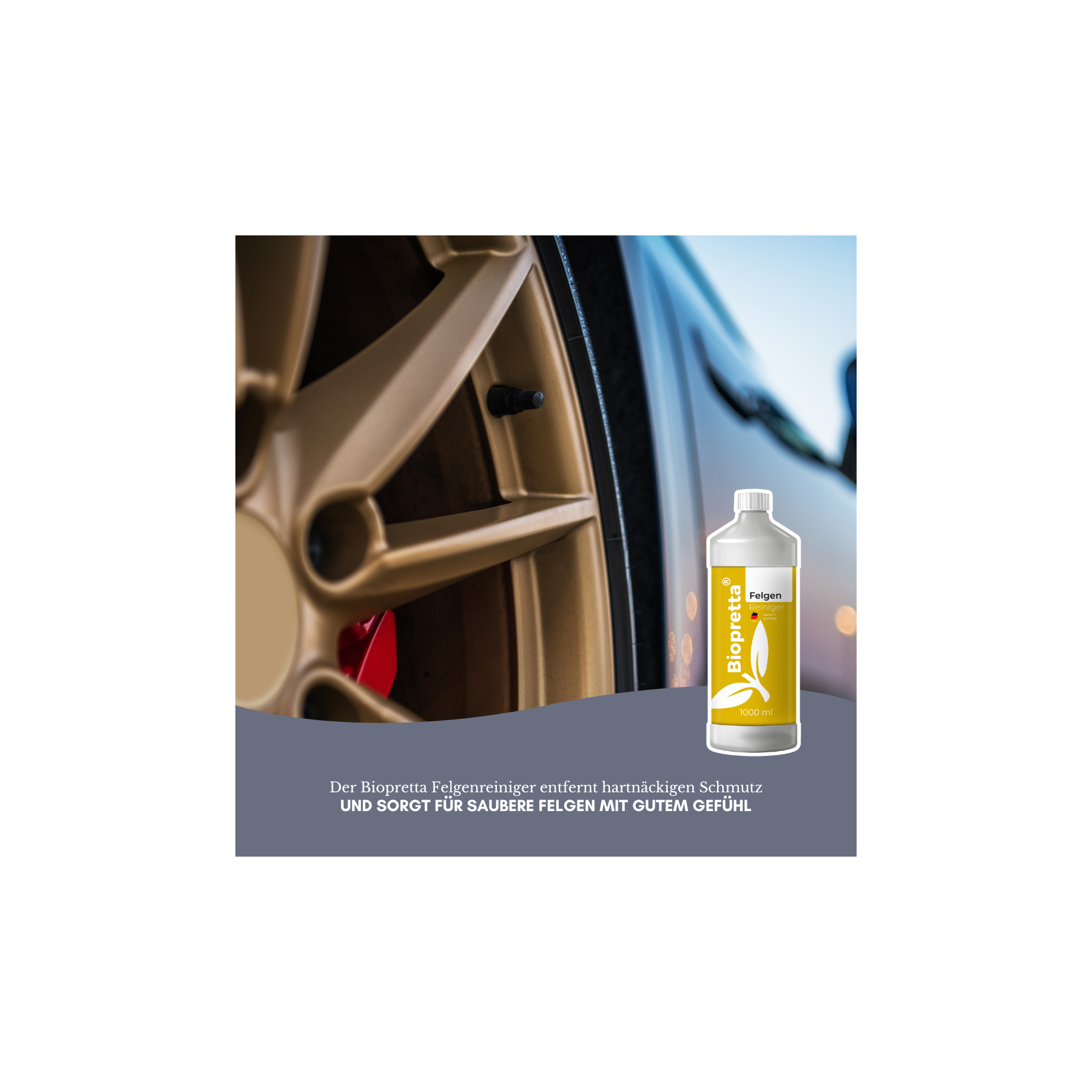 Alkalischer Spezialreiniger für Stahl- und Aluminiumfelgen. Der Biopretta Felgenreiniger ist ein kraftvoller, säurefreier Felgenreiniger zur zuverlässigen Entfernung von Öl, Fett, Bremsstaub, Gummiabrieb und Straßenschmutz. Die materialschonende, alkalische Rezeptur eignet sich ideal für die regelmäßige Reinigung von Stahl- und Alufelgen.