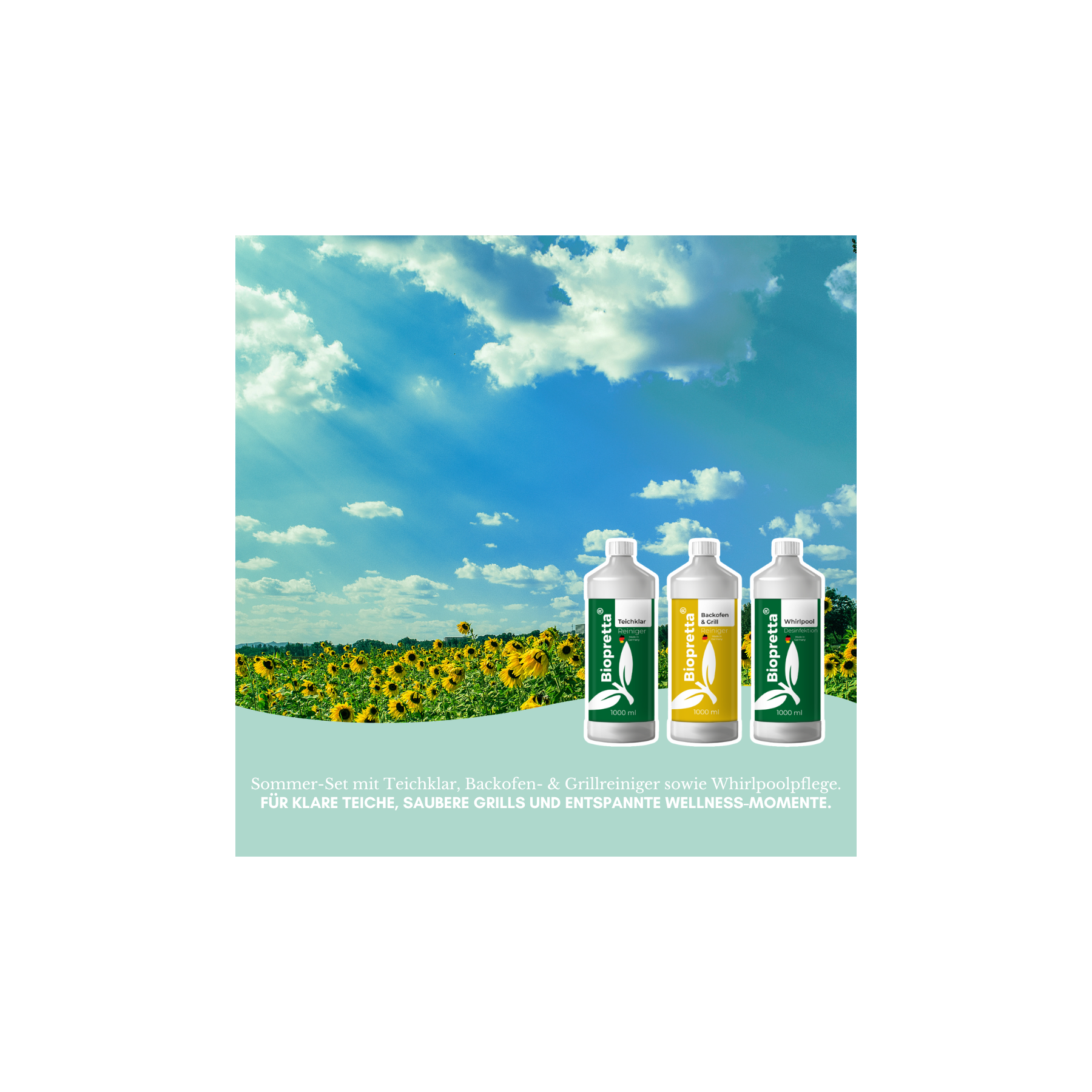Egal ob Gartenparty, Entspannung im Whirlpool oder ein gemütlicher Abend auf der Terrasse – das Biopretta Sommer-Set sorgt dafür, dass Ihr Außenbereich jederzeit gepflegt und einsatzbereit bleibt.